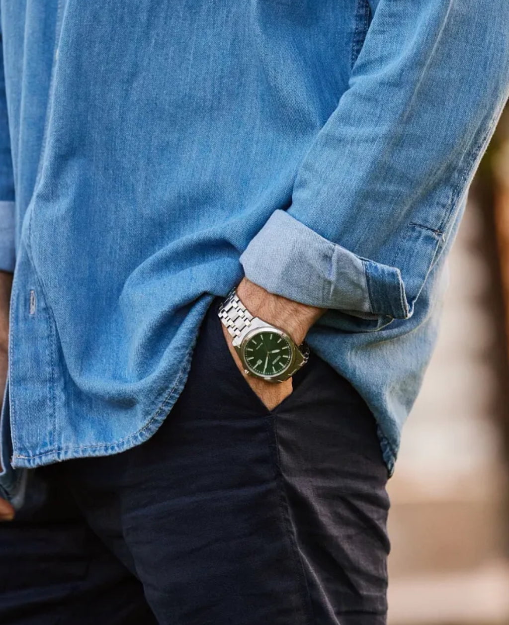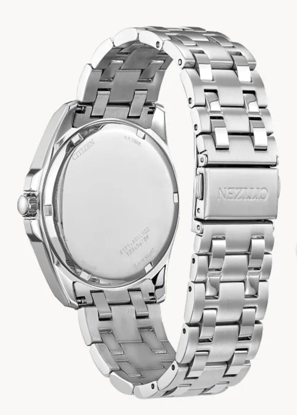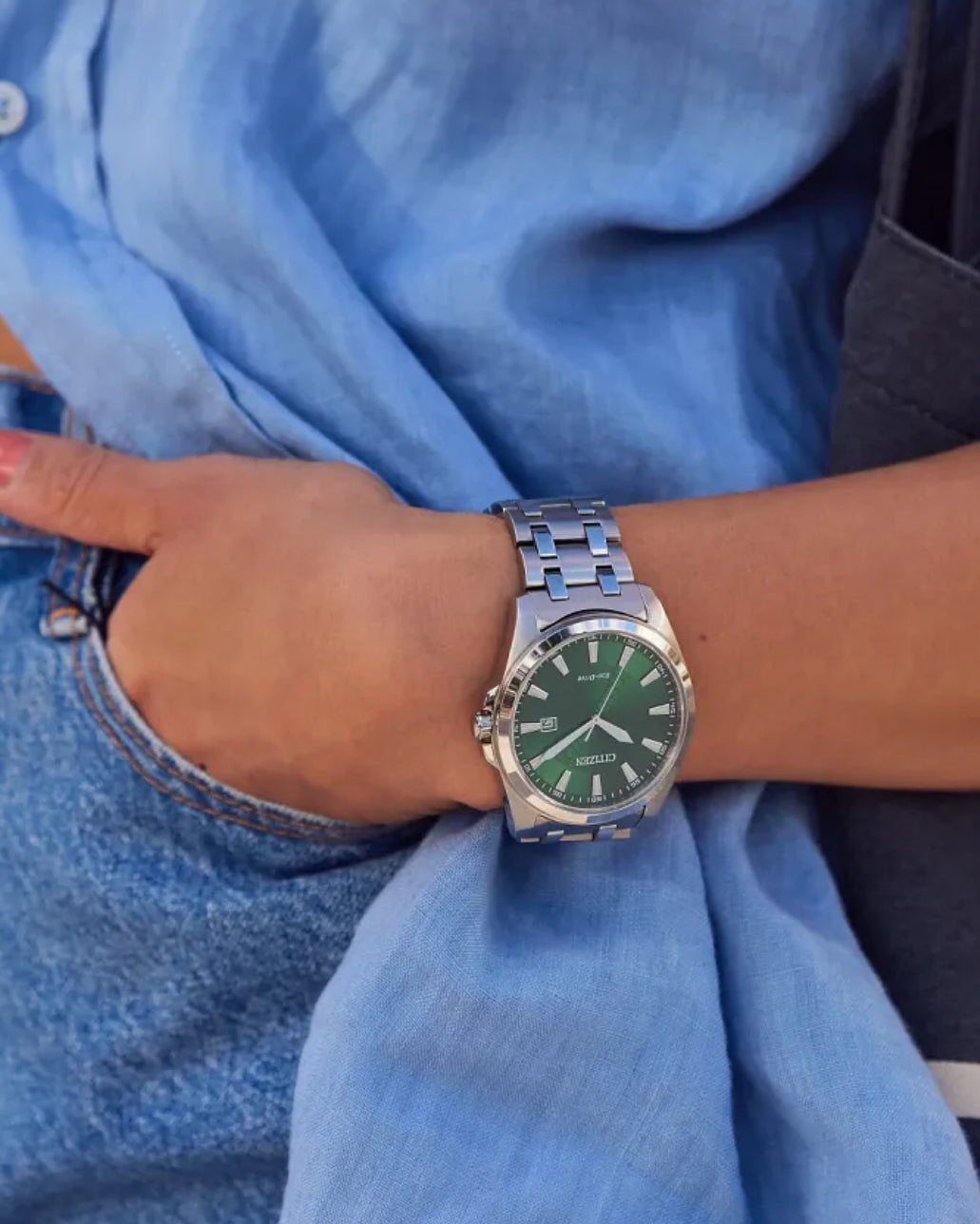 Make a distinctive style statement. Featuring a silver-tone stainless steel case and a green 3-hand dial encased in sapphire crystal, this men’s timepiece is a combination of functional simplicity with a touch of elegance. The silver-tone stainless-steel bracelet has a fold over clasp with push buttons, giving the watch an understated refinement. Water resistant to 100 meters and sustainably powered by any light with Eco-Drive that never needs a battery.