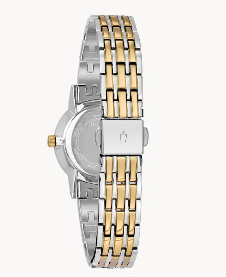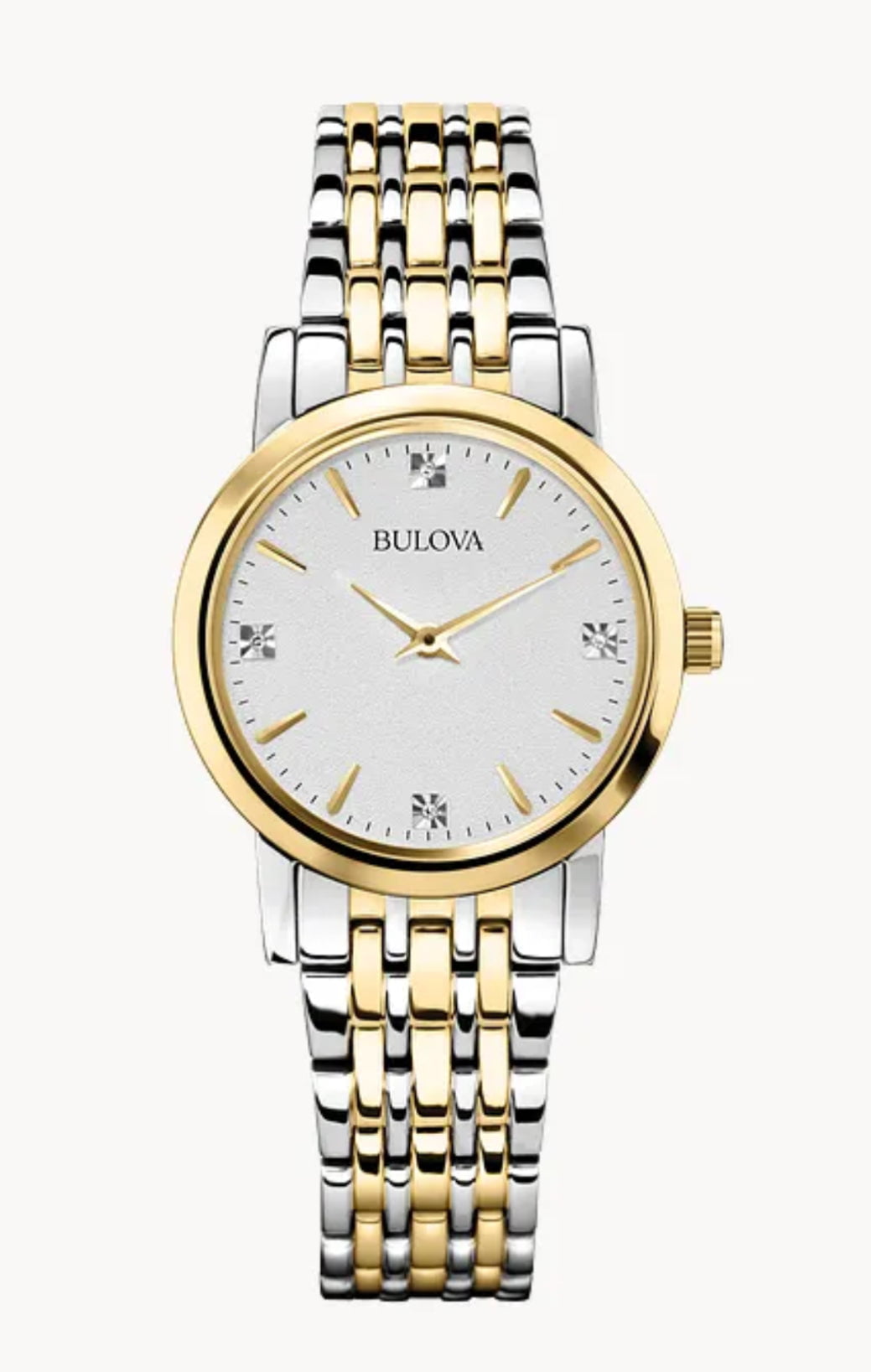 From the Classic Collection. In stainless steel with two-tone finish, 4 diamonds individually hand-set on silver-white patterned dial, and locking fold-over clasp.