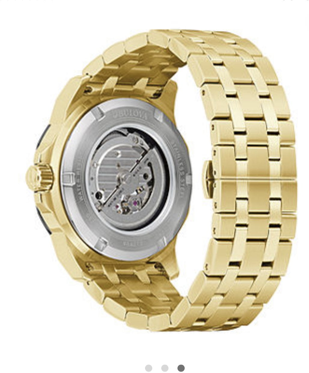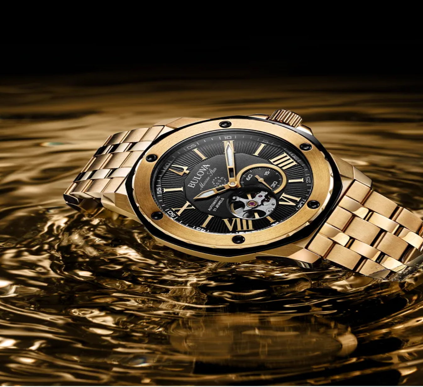 DETAILS The Bulova Marine Star men's watch is a classic timepiece with a legacy stretching back decades. The open heartbeat automatic 21-jewel movement is showcased in the dial aperture and in the exhibition case back. The gold-tone, stainless steel case is accented with black and features a complementary black dial and flat mineral crystal. The gold-tone stainless steel bracelet is perfectly matched for a seamless look and the watch is water resistant to 200 meters, living up to its name as a timepiece that can go wherever you do without missing a beat.