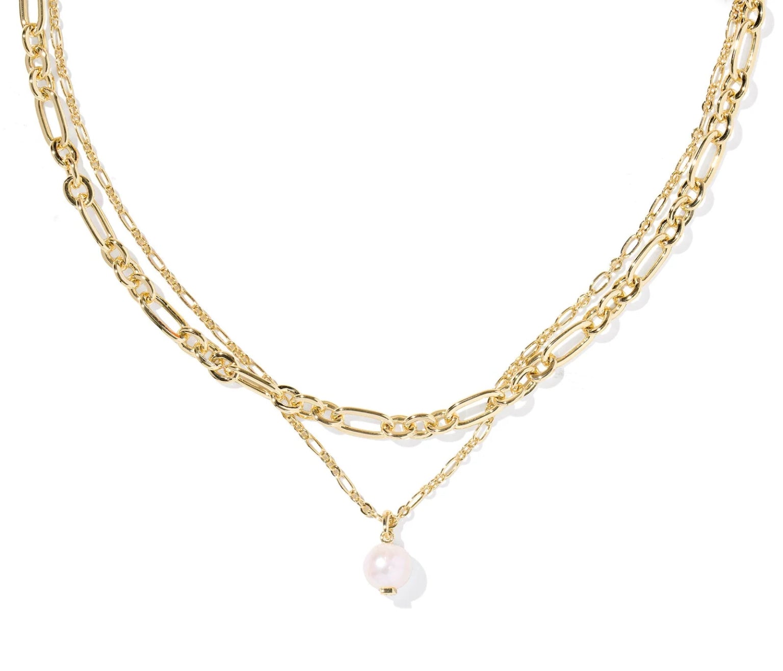 The layered look is easy to achieve with the Ashton Gold Multi Strand Necklace. Two figaro chains and a freshwater cultured pearl combine to create a beautiful necklace with an adjustable length, perfect to wear on its own or with your other favorite pieces.
