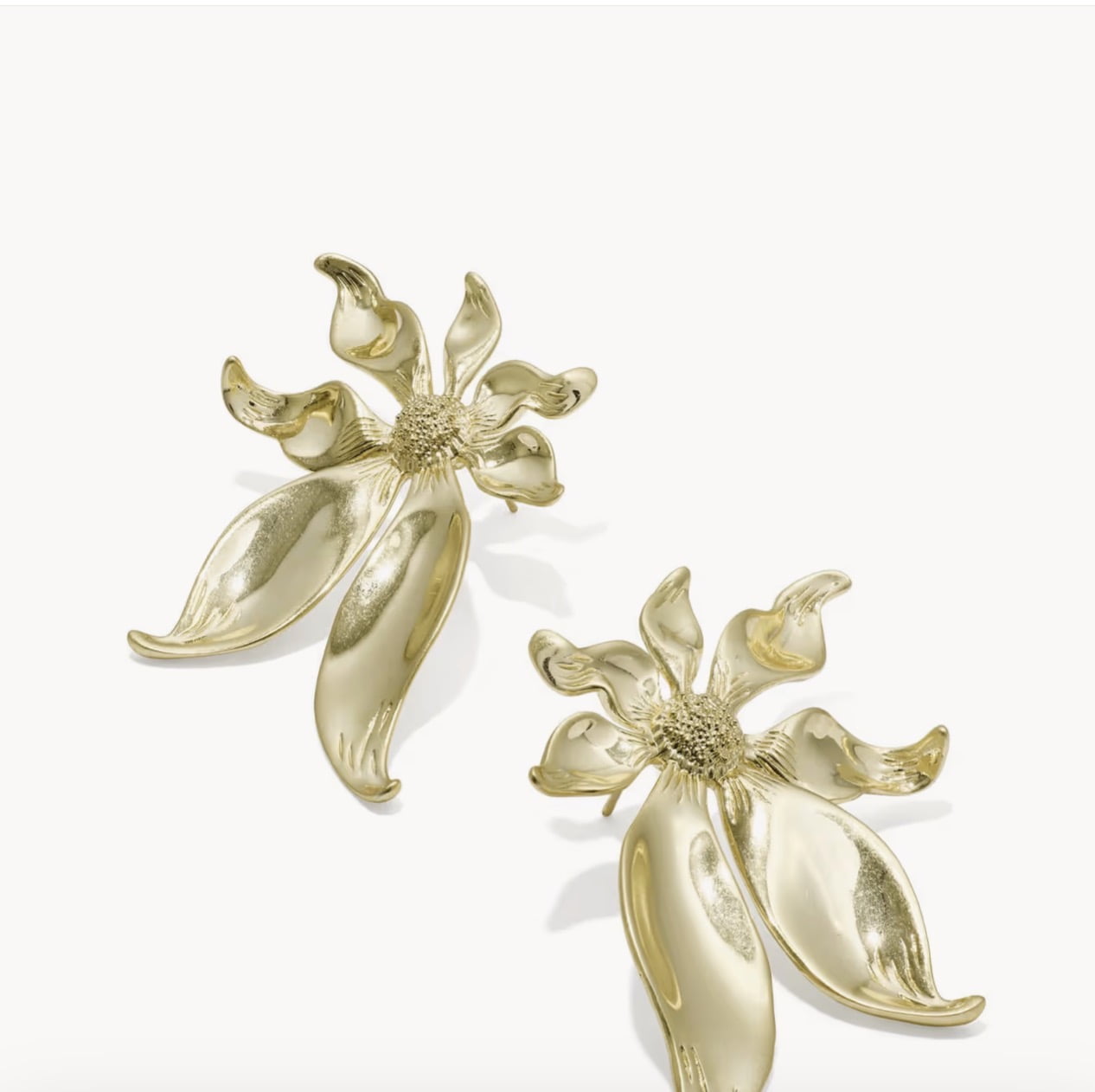 Bold and timeless, the Anya Flower Gold Statement Earrings feature a design inspired by traditional folk art florals. These organic flower-shaped earrings are created with metallic petals surrounding a sparkly white cubic zirconia center for a style that embodies vintage glamour.