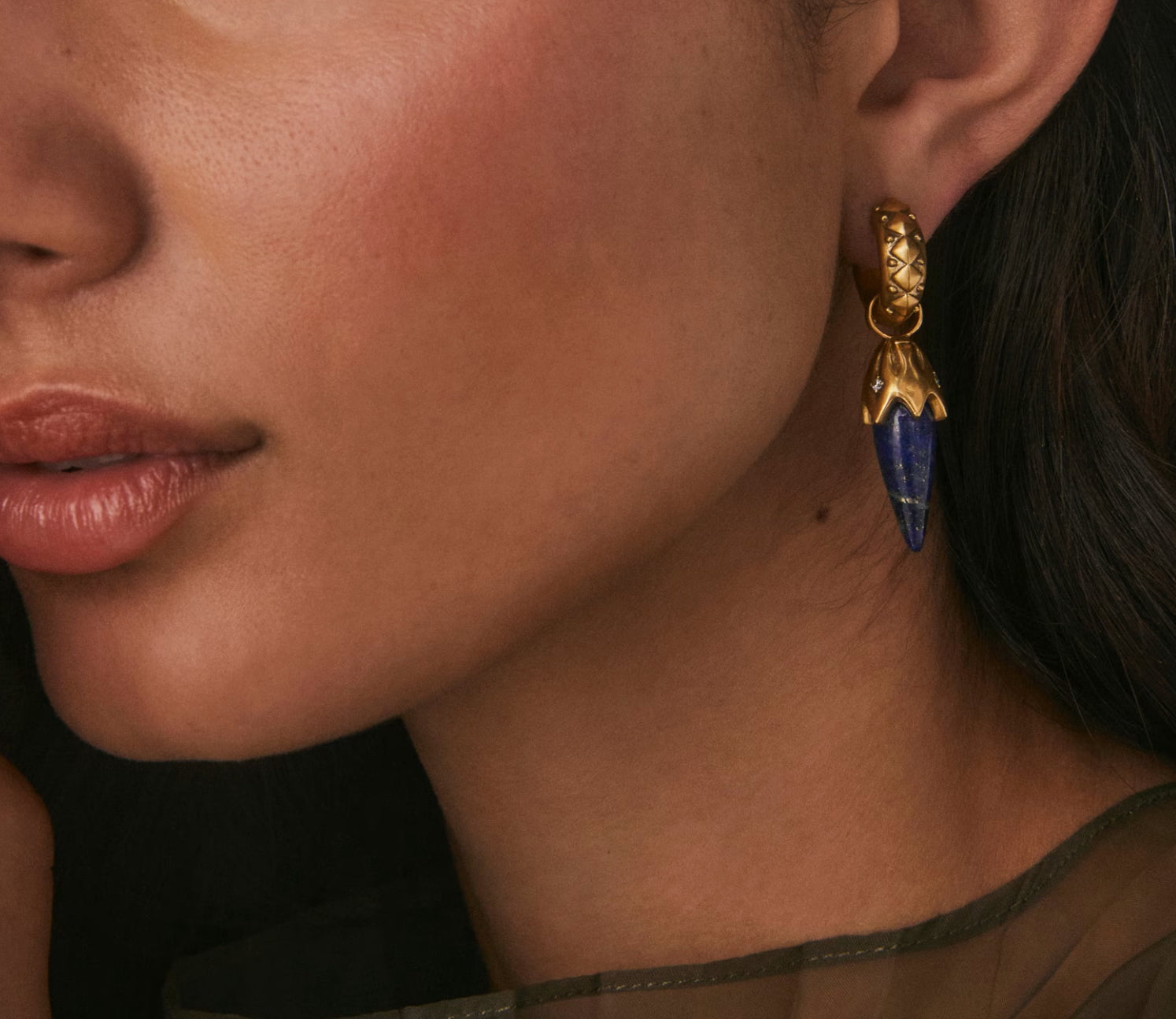 Cute and convertible, the Catherine Vintage Gold Convertible Huggie Earrings are about to be the star of your earring collection. Our bestselling Mikki Huggie Earrings get reimagined with an antique-inspired finish and prismatic detailing for extra dimension. And the blue lapis claw charms are removable, so you can wear these earrings multiple ways, for either a subtle or statement look.