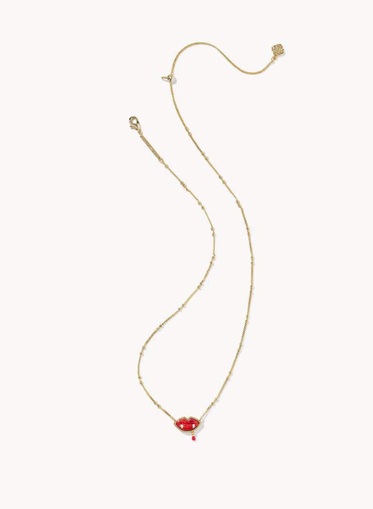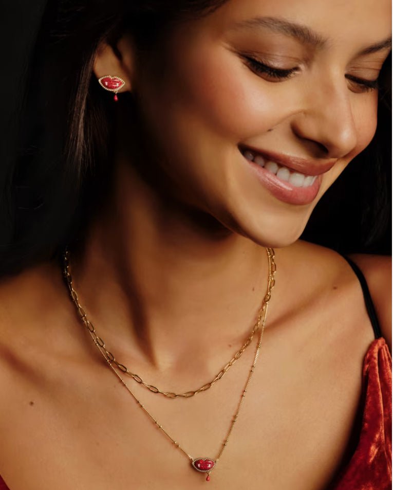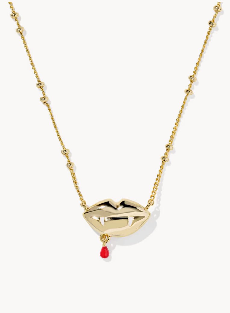 Don’t be scared, the Vampire Gold Short Pendant Necklace doesn’t bite! Featuring a cute lip shape with vampire fangs and a blood drop accent captured in vibrant enamel, this reversible necklace is a scary-good addition to any look.