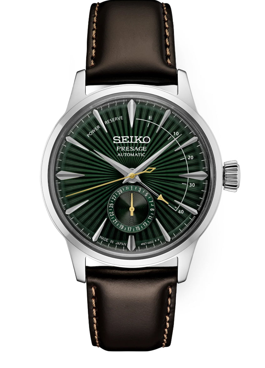 Seiko Presage Cocktail Time. Offering the finest in Japanese mechanical watchmaking, the Presage Collection blends precision technology with superior craftsmanship and design. Inspired by the vibrance of the city’s modern lounges, the newest Cocktail Time designs express the excitement of today’s Tokyo, with fresh styling and colors. Highlighted by a rich green dial with pressed pattern and gloss finish evoking the Mockingbird cocktail, this elegant design includes a power reserve indicator and date subdial. The 29-jewel automatic movement, with manual winding capability, beats at a frequency of 21,600 vibrations per hour, with a power reserve of approximately 41 hours. Crafted of stainless steel, with brown leather strap, this distinctive timepiece includes a box-shaped crystal, screwdown see-through caseback, and tri-fold push button release clasp. 5 bar, 50M Water ResistantSeiko Presage Cocktail Time