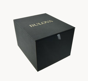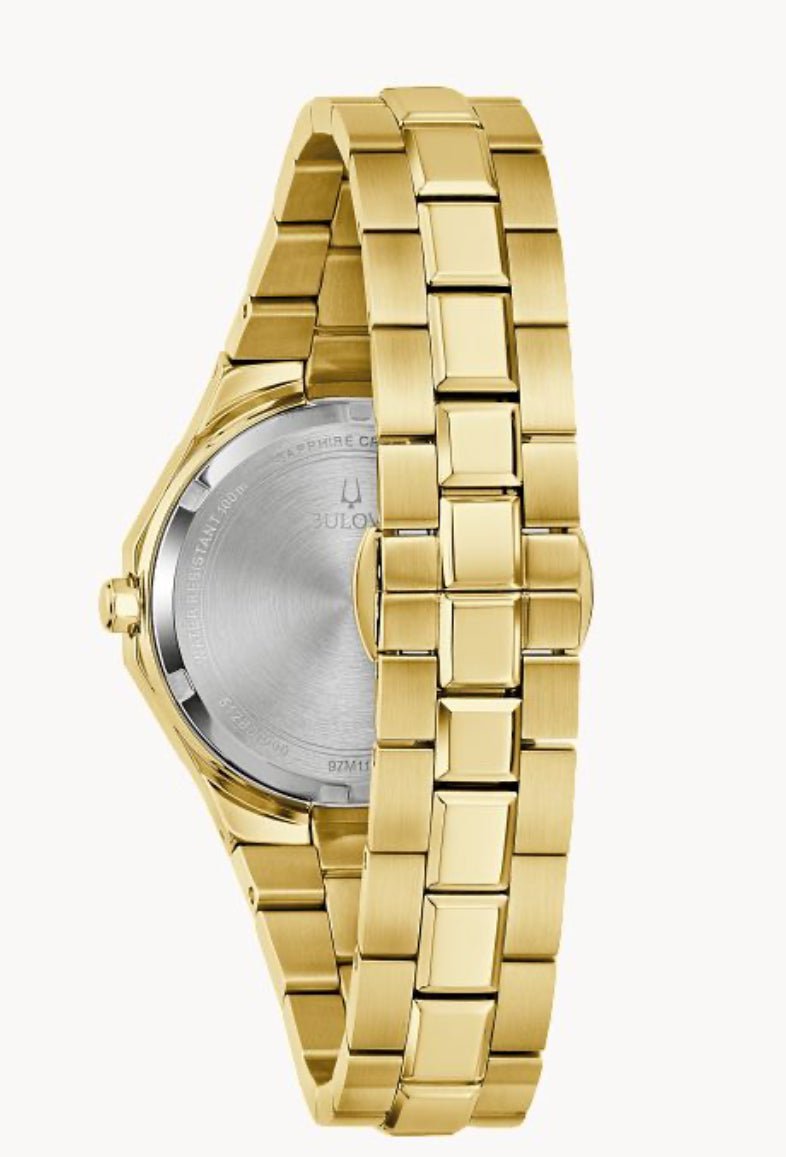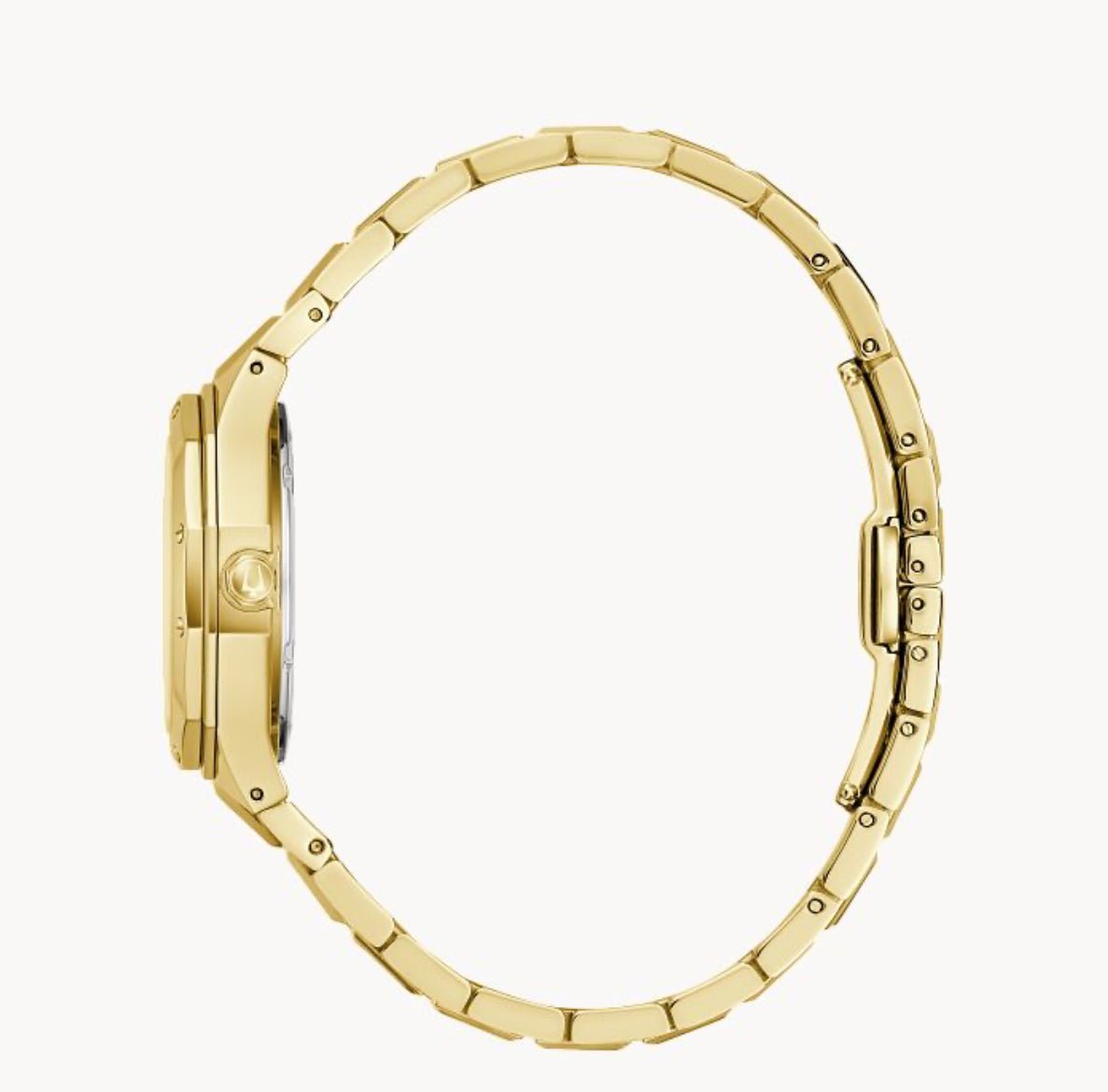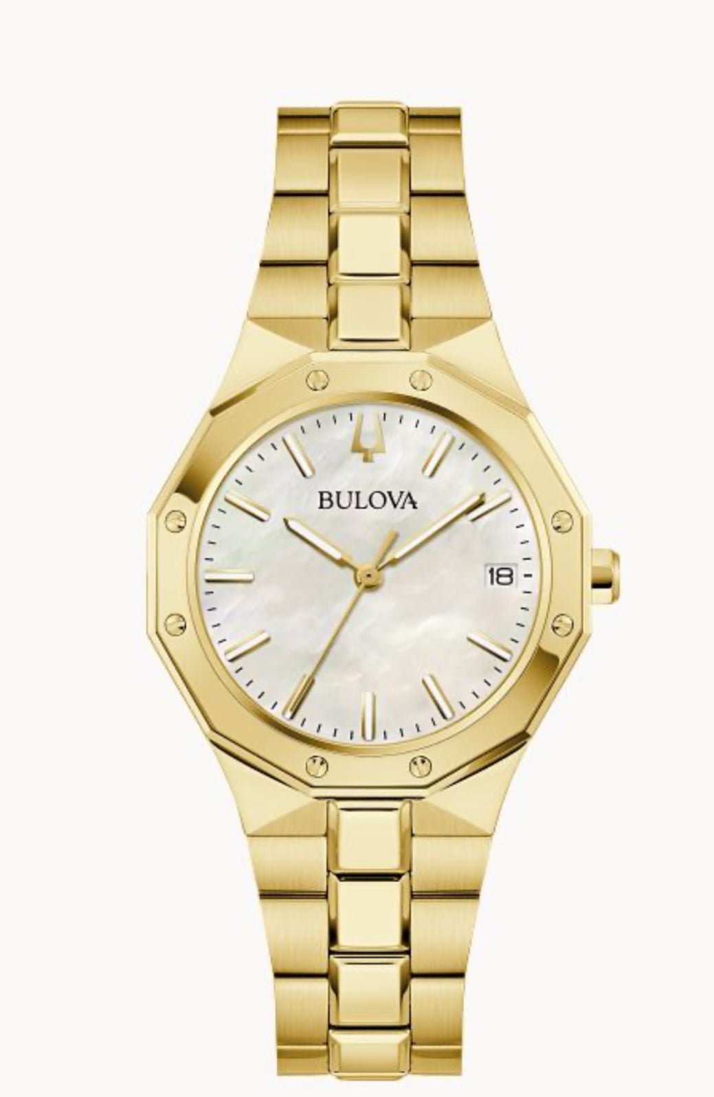 Bold, elevated design characterizes this Classic Bulova Prestige women’s timepiece that balances bold design with an elegant presence. The watch features a faceted 32mm gold-tone stainless steel case with a geometric bezel, flat sapphire crystal with anti-reflective coating, 100m of water resistance, and a chamfered 3-link bracelet with brushed and polished finishes and a push-button deployant closure. The lustrous mother-of-pearl dial has gold-tone hands and applied markers with Super-LumiNova luminescent fill and a date display. Striking in both its modernity and its sophistication, this Bulova ladies’ watch is an ideal companion on any wrist.