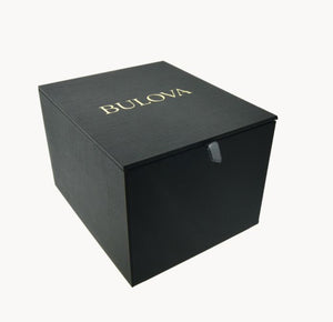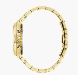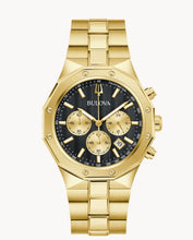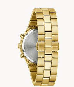 Bold, modern design characterizes this 6-hand chronograph from the Classic Bulova Prestige men’s collection. The watch features a faceted 40mm gold-tone stainless steel case with a geometric bezel, flat sapphire crystal with anti-reflective coating, 100m of water resistance, and a chamfered 3-link bracelet with a combination of brushed and polished finishes and a push-button deployant closure. The black textured dial with elegant striping has gold-tone hands and applied markers with Super-LumiNova luminescent fill, a date display, and gold-tone sub-dials including a 24-hour display. Highly functional with a distinctive design, this timepiece is suited for any occasion, from the everyday to the extraordinary.