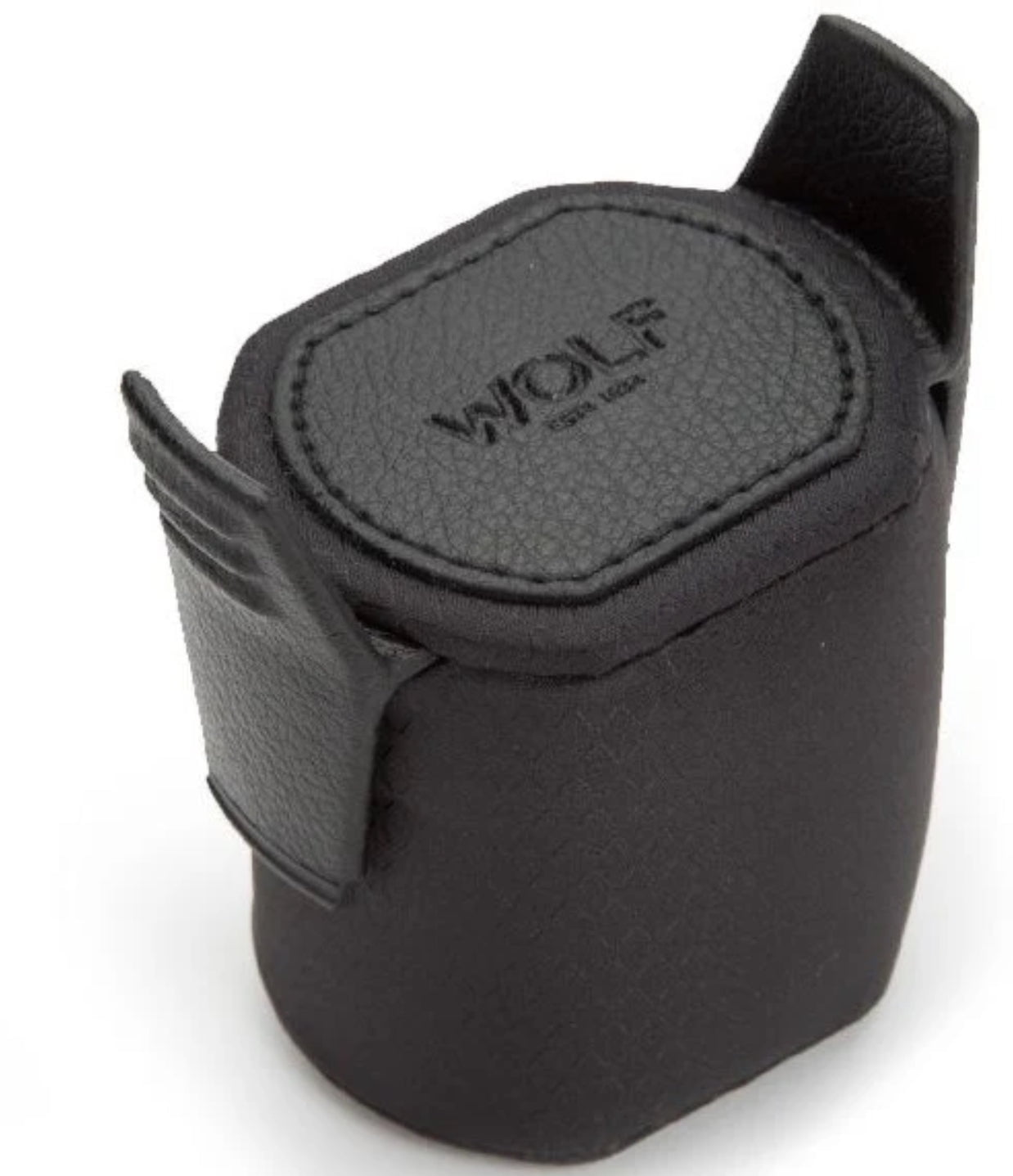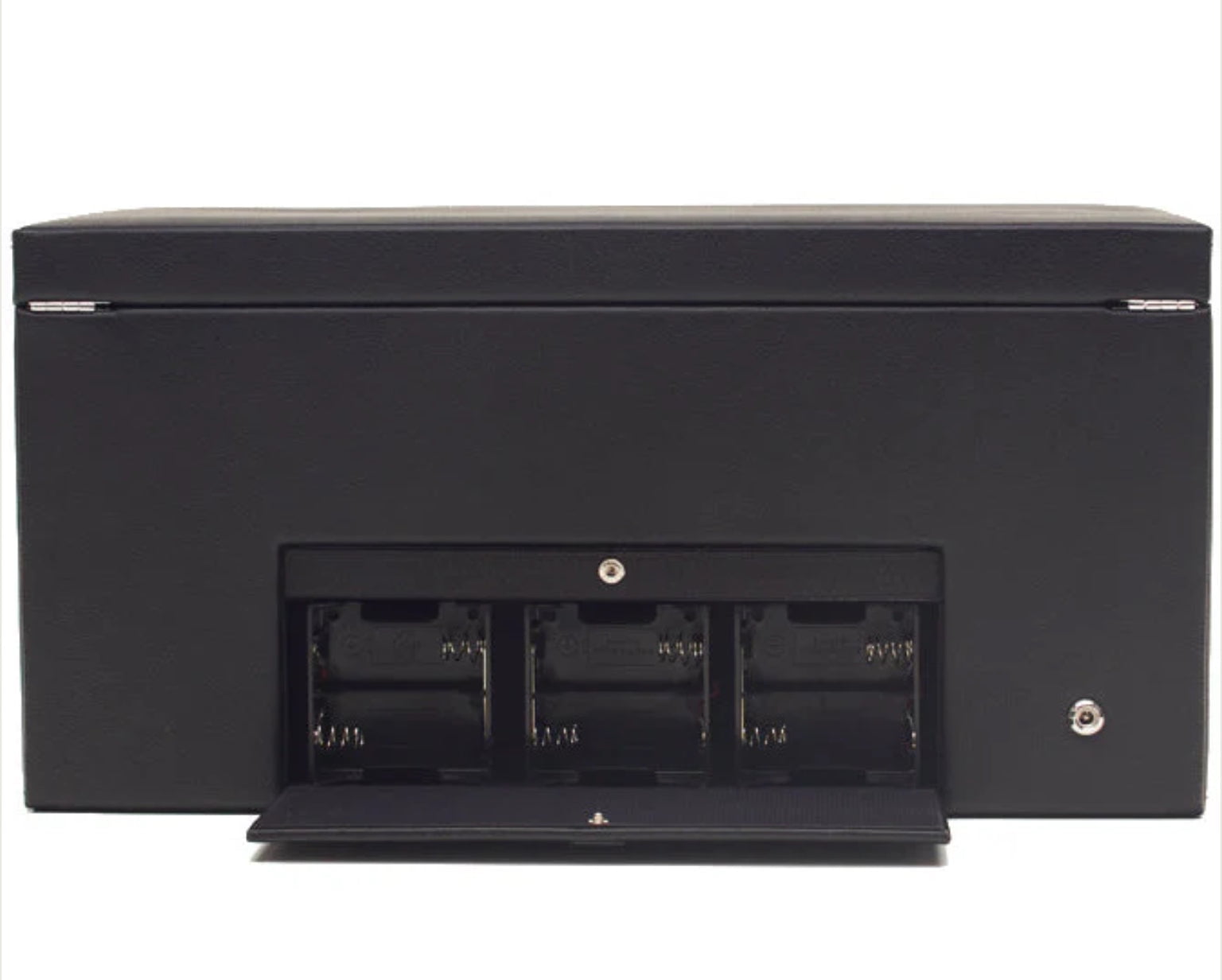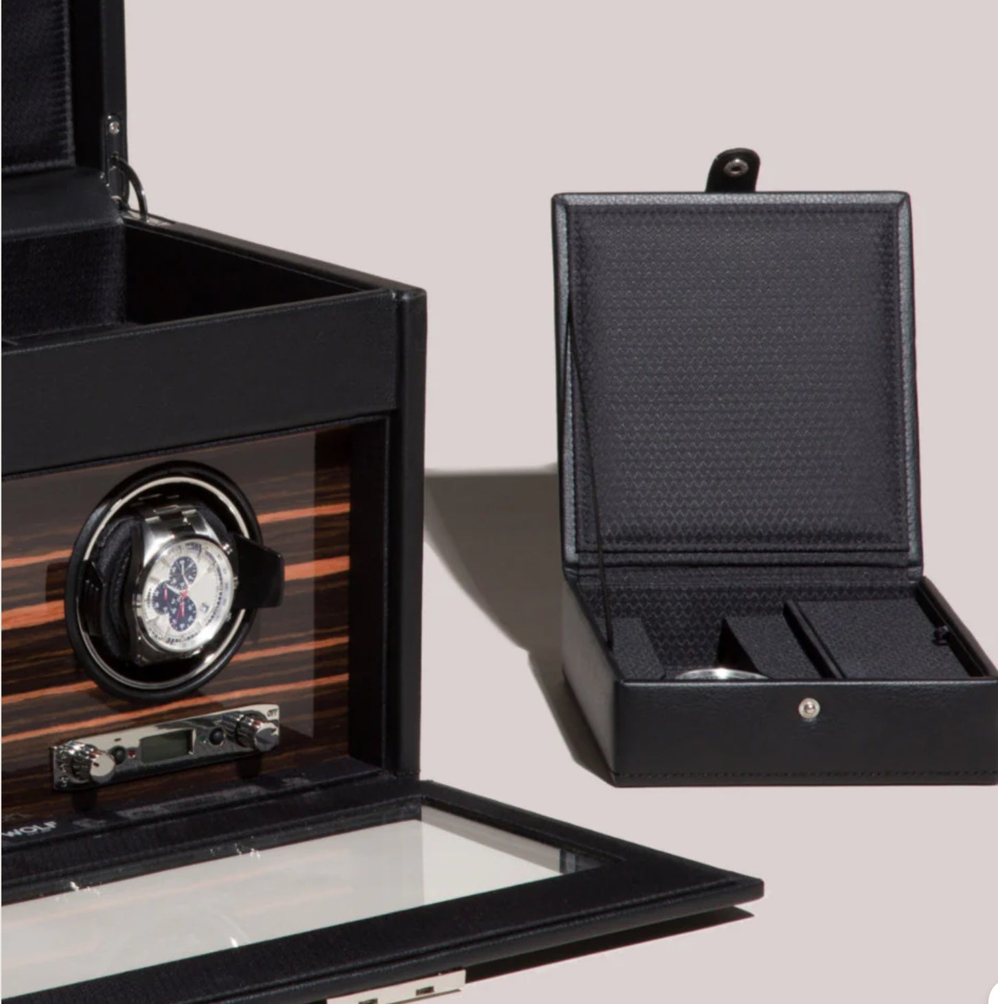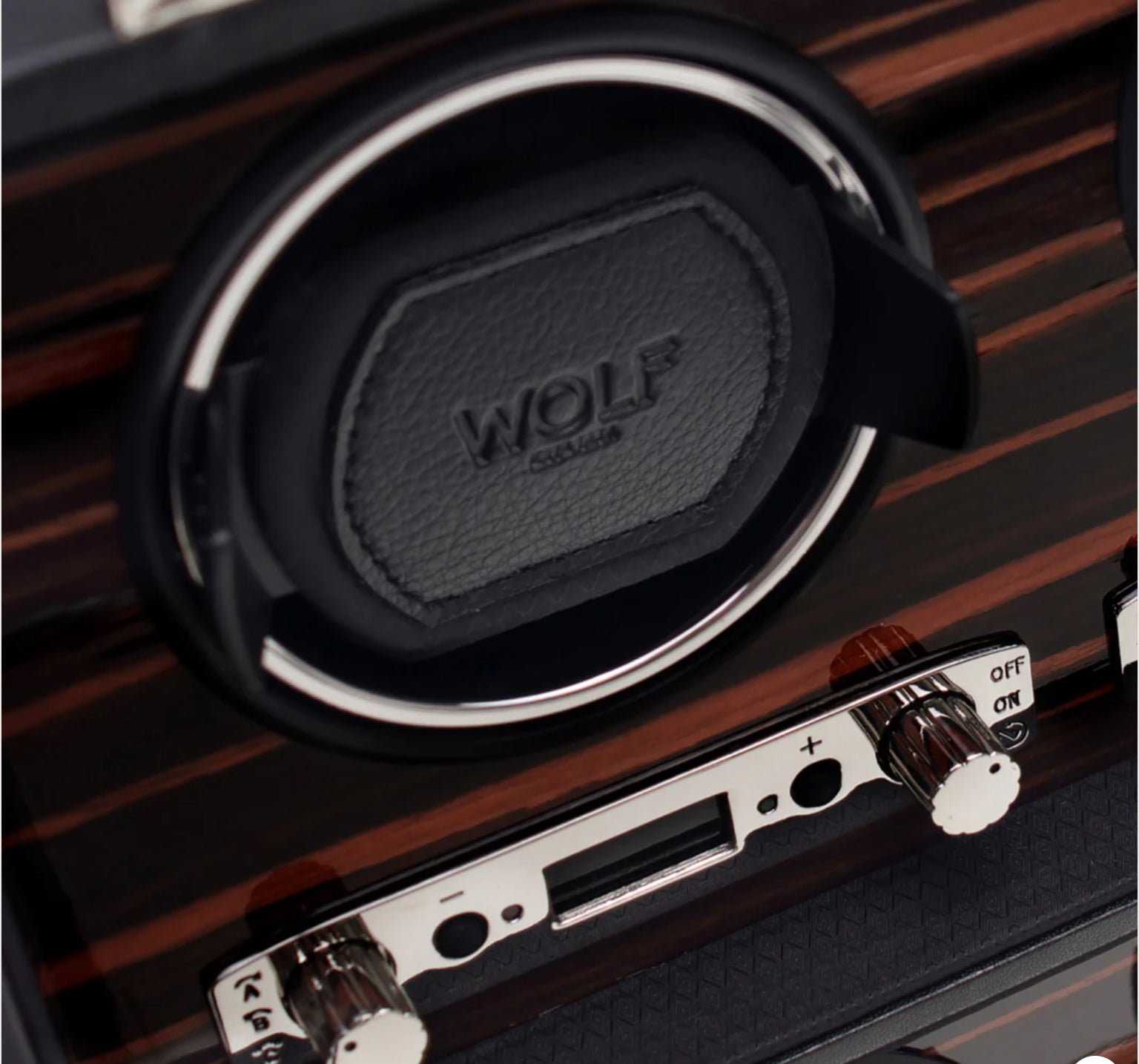 The Roadster Series from WOLF takes its inspiration from the luxury British motorcars of Bristol, Jaguar, and Aston Martin with its polished chrome, soft supple glove leathers and exotic aged woods. The triple unit watch winder has a vegan leatherette exterior shell with a luxurious high gloss macassar wood faceplate and polished chrome hardware. Equipped with a key lockable glass cover to protect and showcase your timepiece while winding with an LED back-lit winding display. The system is programmable with 300-1200 TPD (turns per day) and start/delay mode with clockwise, counter clock-wise and bi-directional rotations. Large removable satin lined cuffs will accommodate watches up to 52mm in size. A top-unit storage compartment will hold five additional watches with a removable storage case for travel. Powered by batteries or use the the AC power adapter.
