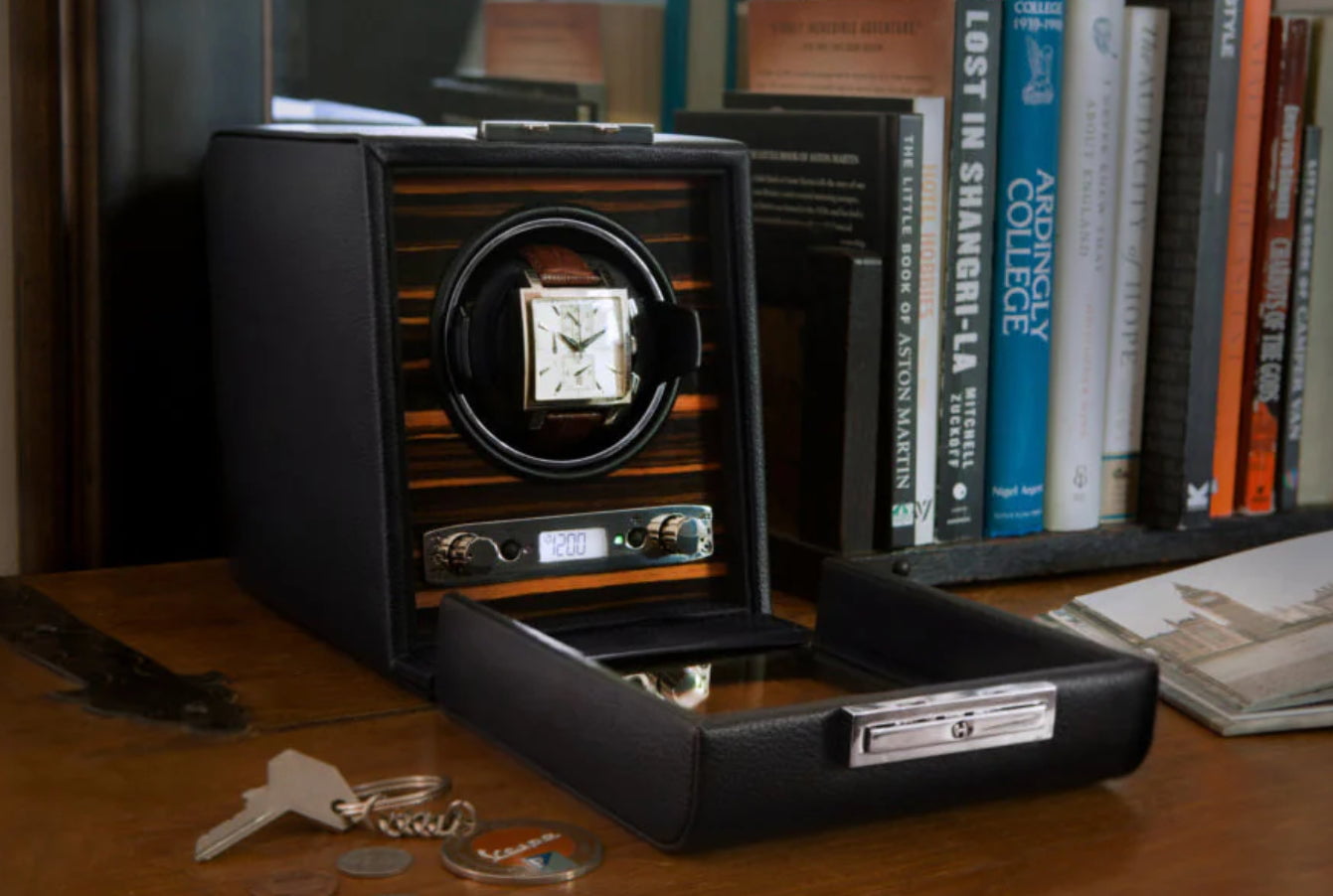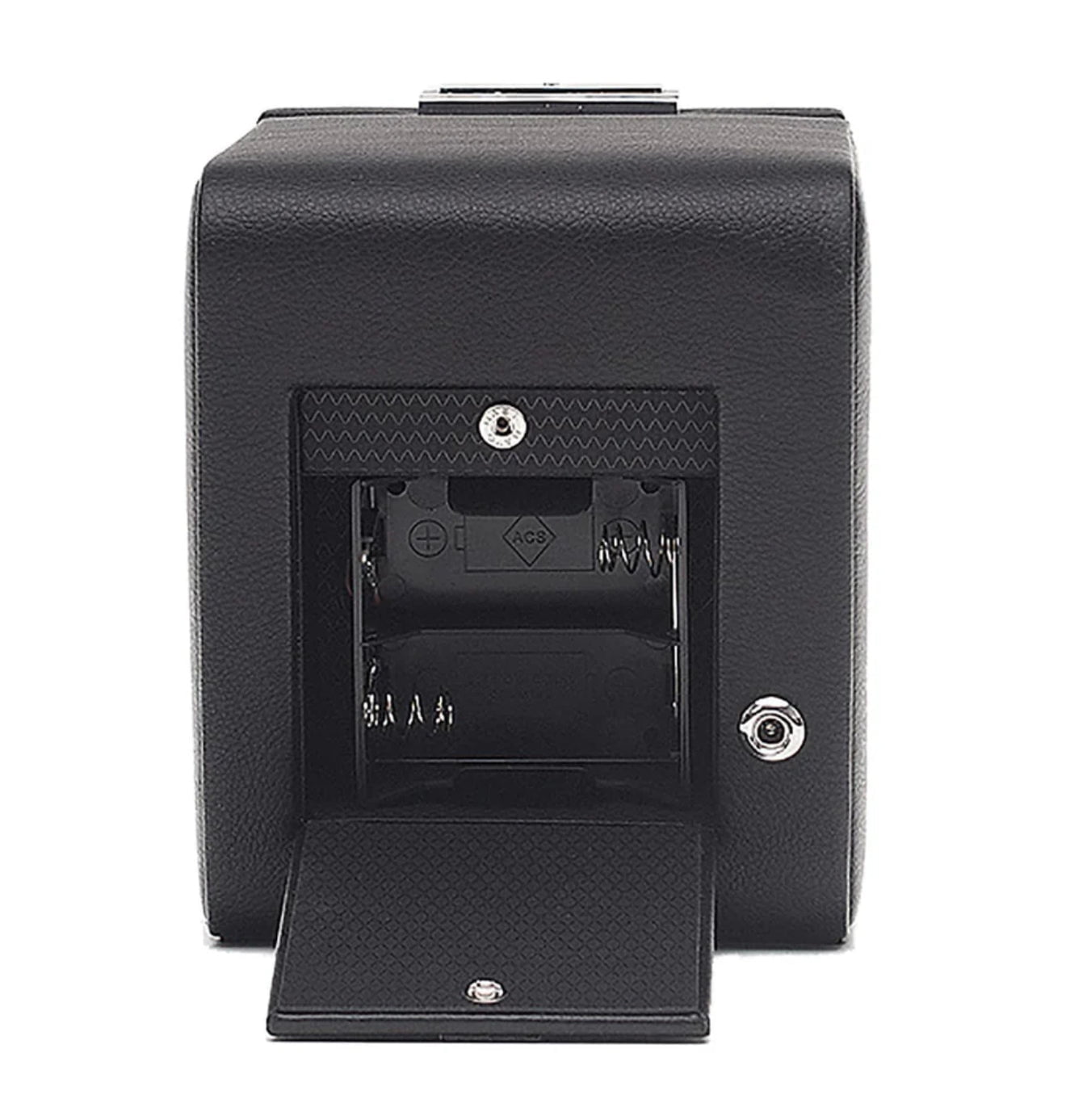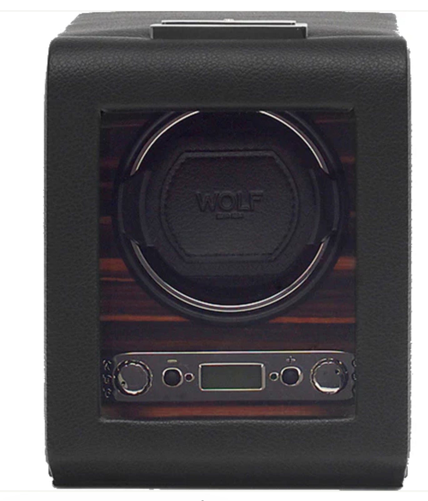 The Roadster Series from WOLF takes its inspiration from the luxury British motorcars of Bristol, Jaguar, and Aston Martin with its polished chrome, soft supple glove leathers and exotic aged woods. The single-unit watch winder has a vegan leatherette exterior shell with a luxurious high gloss macassar wood faceplate and polished chrome hardware. Equipped with a key lockable glass cover to protect and showcase your timepiece while winding with an LED back-lit winding display. The system is programmable with 300-1200 TPD (turns per day) and start/delay mode with clockwise, counter clock-wise and bi-directional rotations. A large removable satin lined cuff will accommodate watches up to 52mm in size. Powered by batteries or use the AC power adapter.