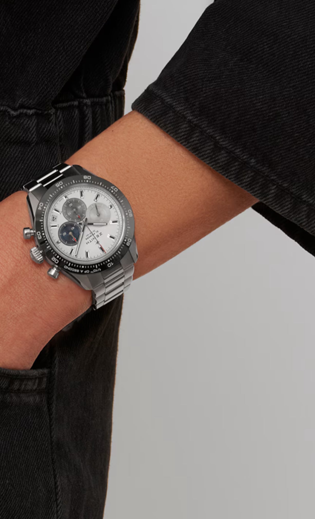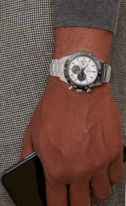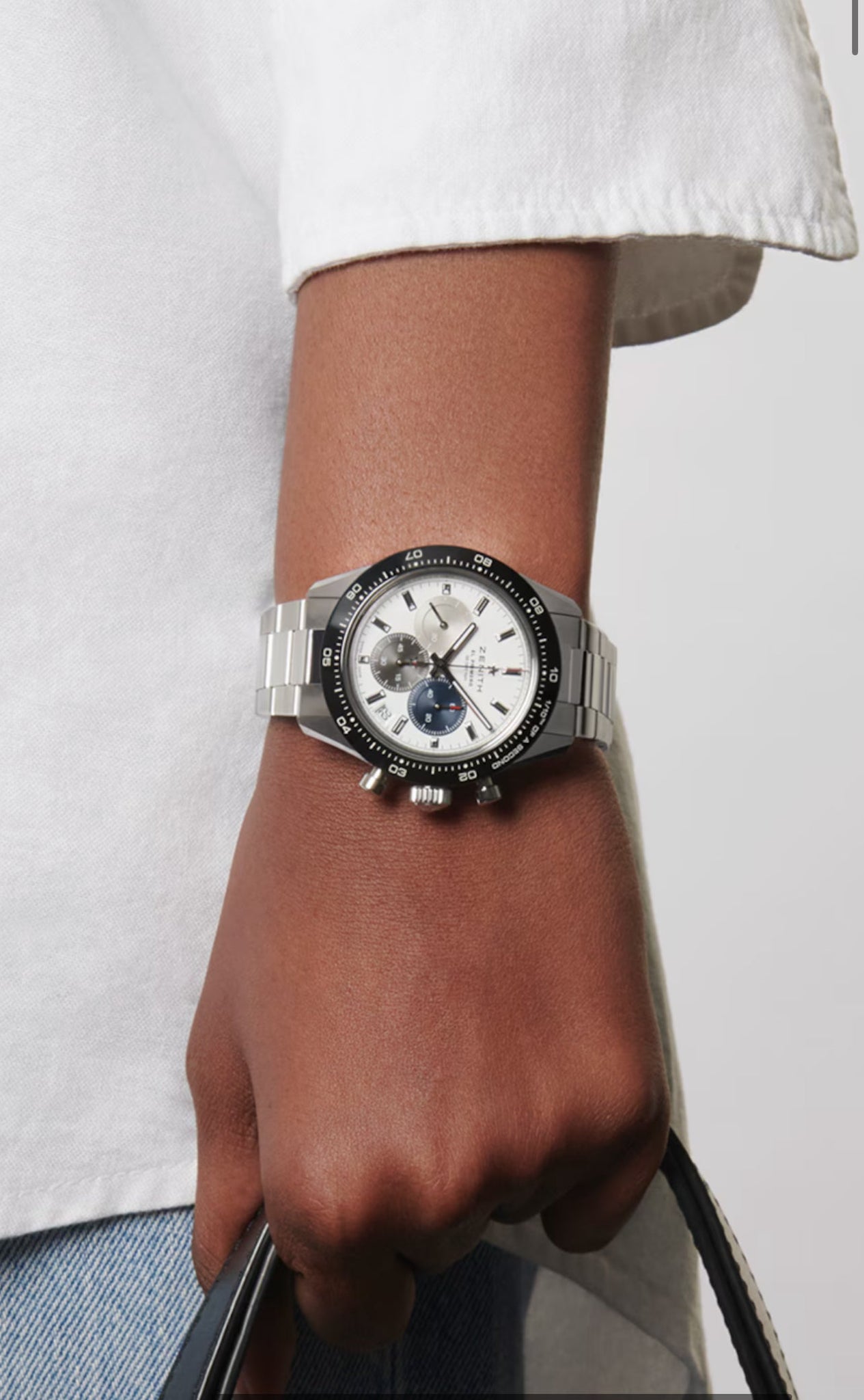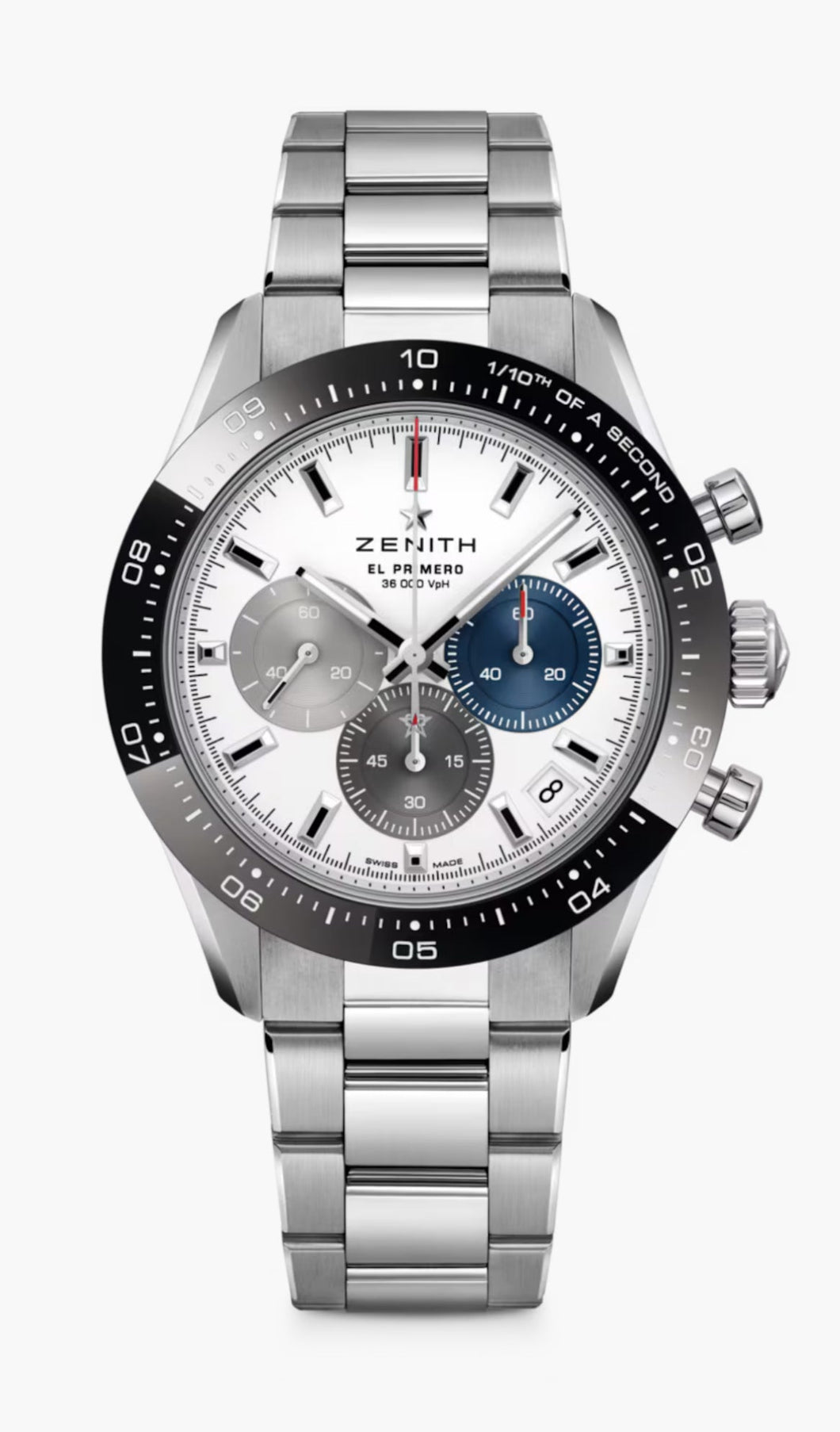 The Chronomaster Sport combines elements of past Zenith chronograph references such as the tri-colour dial, pump-style pushers and steel bracelet with a black ceramic bezel, all in a modern 41mm case. This version features a white dial paired with an integrated steel bracelet. Powered by the El Primero 3600 1/10th of a second automatic chronograph movement.